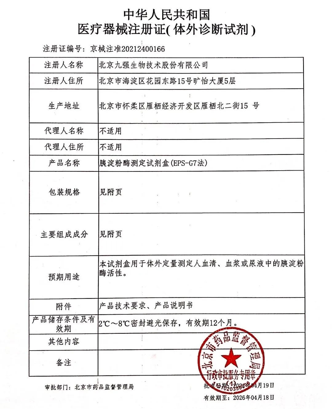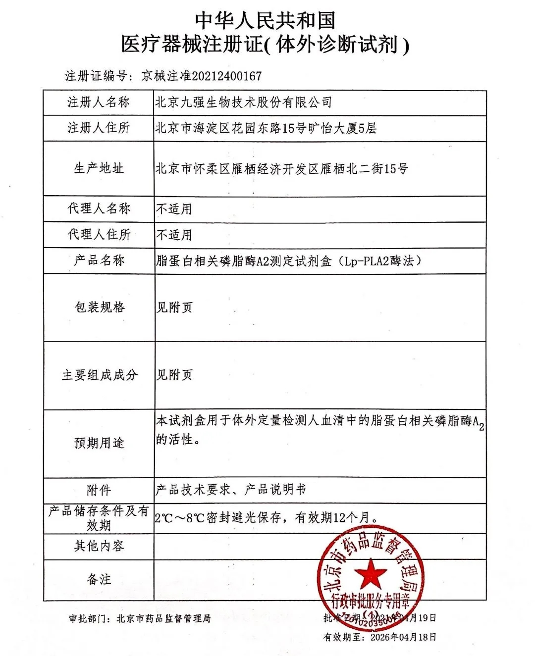 九強生物順利取得北京市藥品監(jiān)督管理局頒發(fā)的三項產(chǎn)品的《醫(yī)療器械注冊證》:谷胱甘肽還原酶(液體)測定試劑盒(谷胱甘肽底物法)、脂蛋白相關(guān)磷脂酶A2測定試劑盒(Lp-PLA2酶法)和胰淀粉酶測定試劑盒(EPS-G7法)。