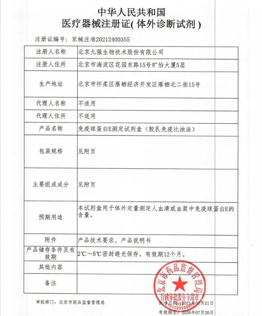 九強(qiáng)生物順利取得國家藥品監(jiān)督管理局頒發(fā)的免疫球蛋白E測定試劑盒(膠乳免疫比濁法)的《醫(yī)療器械注冊證》。