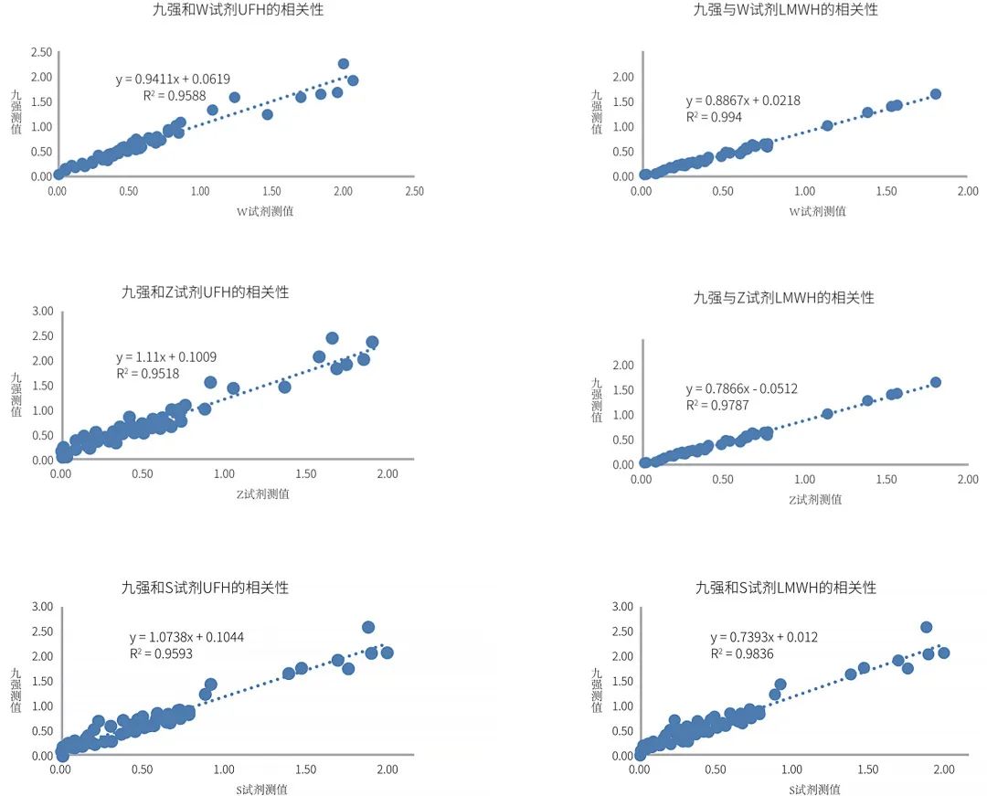 九強(qiáng)抗Xa測(cè)定試劑盒(發(fā)色底物法)通過(guò)顏色變化來(lái)測(cè)定抗凝強(qiáng)度/血藥濃度,線(xiàn)性寬,抗干擾能力強(qiáng),精密度高,與市場(chǎng)主流廠家試劑相關(guān)性良好,R2>0.95,可滿(mǎn)足臨床檢測(cè)需求。