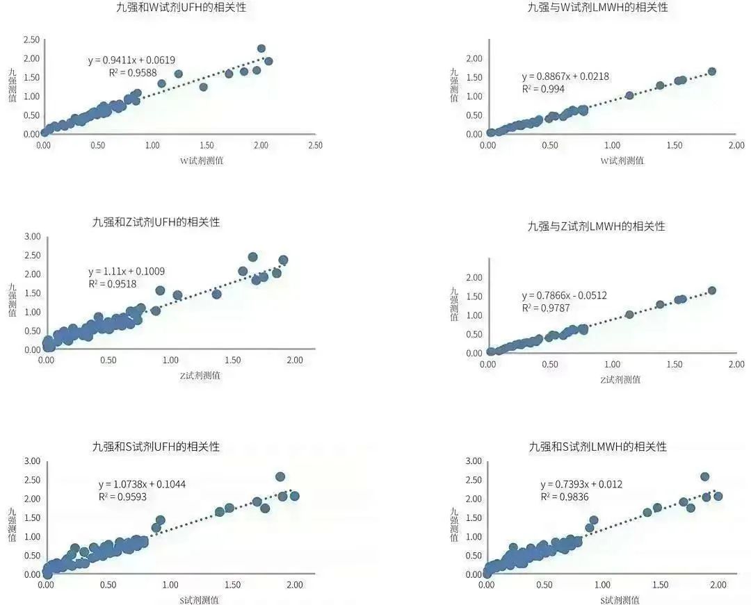 (2)國產(chǎn)抗Xa試劑可以滿足臨床預(yù)期用途:九強抗Xa試劑盒普通肝素線性可以做到4IU/mL,不僅可以滿足說明書所宣稱的1.2IU/mL,同時可以滿足臨床上的一些異常特殊高值樣本的檢測需求;
