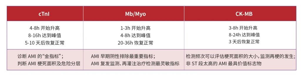 心肌細(xì)胞損傷后,細(xì)胞內(nèi)各種成分進(jìn)入血液循環(huán),其中某些成分能較為特異和敏感地反應(yīng)心肌損傷,成為心肌損傷標(biāo)志物。心肌損傷標(biāo)志物與臨床表現(xiàn)、心電圖一起為心肌梗死診斷提供依據(jù)[4]。