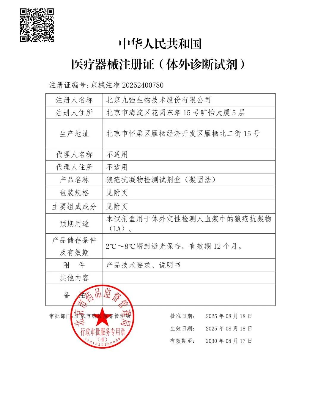近日,九強生物狼瘡抗凝物檢測試劑盒(凝固法)順利取得國家藥品監(jiān)督管理局頒發(fā)的《醫(yī)療器械注冊證》(注冊證號:京械注準 20252400780)。
